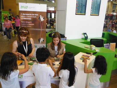 Durante a manhã, estivemos na zona das Partidas a realizar montagem de cágados e morcegos com reutilização de materiais, distribuímos desenhos para colorir e alguns brindes oferecidos pelo aeroporto de Faro.