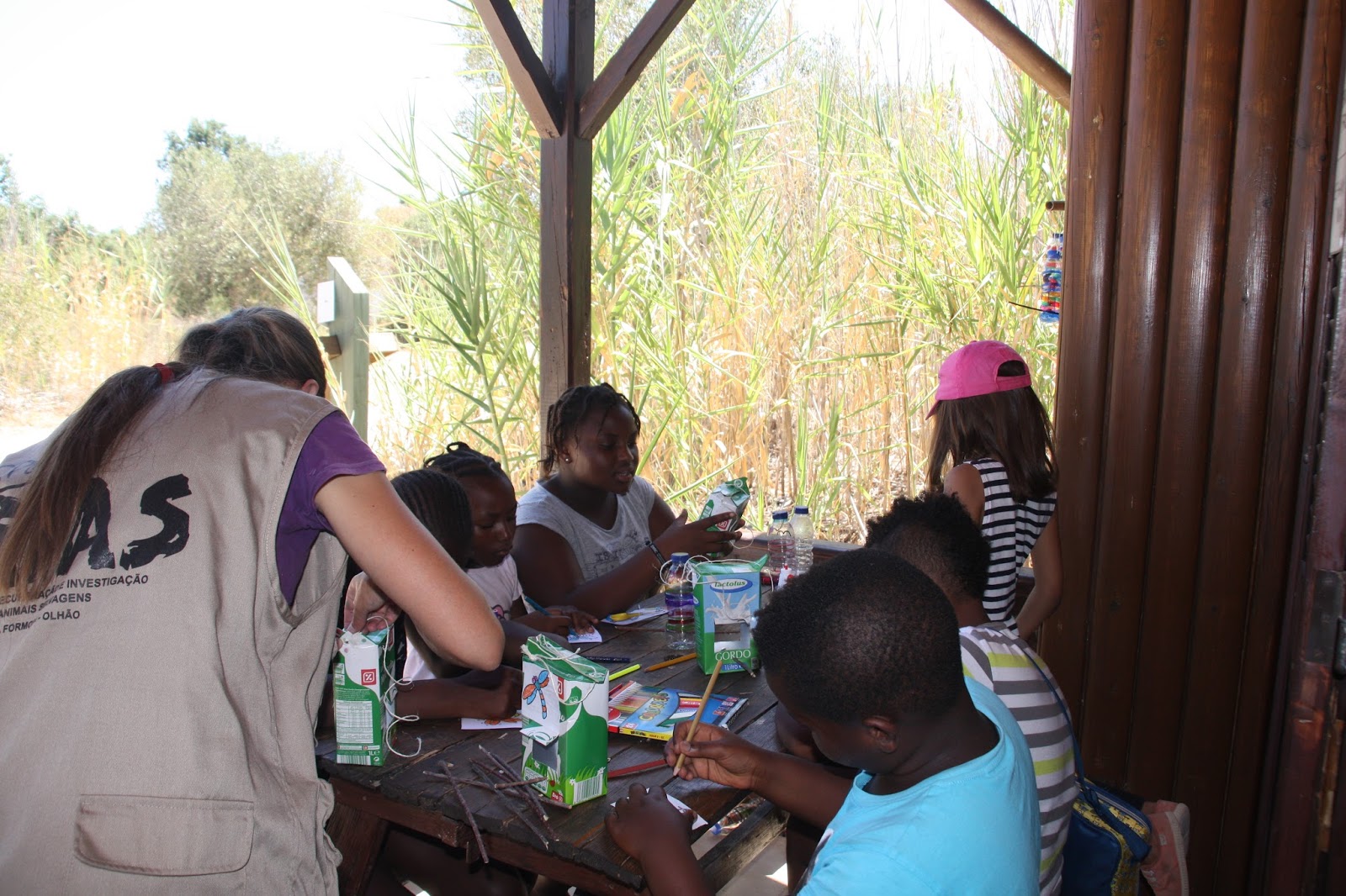 Depois iniciou-se a parte prática com construção de comedouros de garrafas PET e pacotes de leite.
